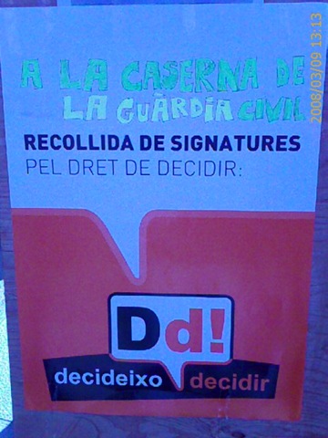 I per mi el que feiem no era ilegal. És que demanar una cosa és ilegal? demanar que et deixin dedidir és ilegal? Si et conformes en participar un cop cada quatre anys ho trobo molt bé, però jo en començo a estar cansat, que vols que t'hi digui!!. i per cert, si tant ilegal era, com és que la junta electoral provincial de Girona va deixar que les taules recollissin les signatures?